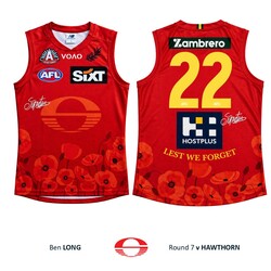 - You're bidding on Ben Long's official Gold Coast SUNS 2026 ANZAC Appeal Round guernsey from the Round 7 clash against Hawthorn at UTAS Stadium, Tasmania on Saturday 25th April, 2026.