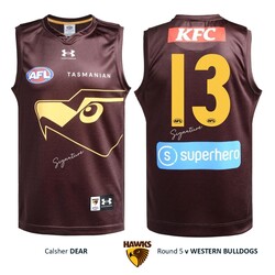 - This authentic guernsey has been certified by Hawthorn to SE Products - the official memorablia licensee of the AFL - to be the official player guernsey of Calsher Dear for the Round 5 clash between Hawthorn and Western Bulldogs.