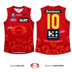- You're bidding on Charlie Ballard's official Gold Coast SUNS 2026 ANZAC Appeal Round guernsey from the Round 7 clash against Hawthorn at UTAS Stadium, Tasmania on Saturday 25th April, 2026.