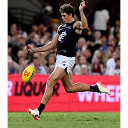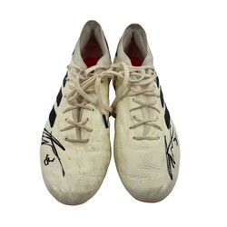 Charlie Curnow's match-used boots from Round 0, worn in Carlton's win over the Brisbane Lions. Both boots are signed, capturing a piece of on-field history from one of the Blues' star forwards.