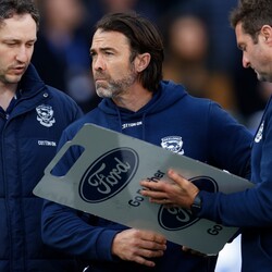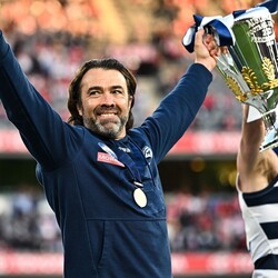 Bid now for this official 2022 Geelong Coaches-Issue Hoodie worn by Chris Scott during the 2022 AFL Grand Final against the Sydney Swans at the MCG on Saturday 24th September, 2022.