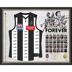 Bid now for this official Collingwood 2023 Premiers Team Signed Guernsey & Scorecard Display