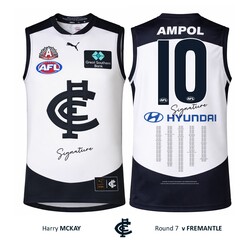 • This authentic guernsey has been certified by Carlton Football Club to SE Products - the official memorabilia licensee of the AFL - as having been the official player guernsey of Harry McKay for the Round 7 match