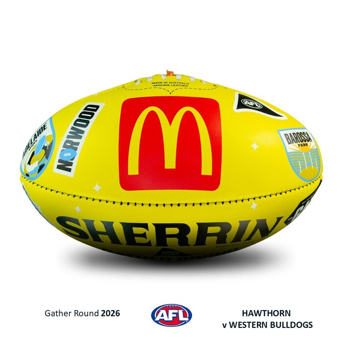 - You're bidding on an official match-used Sherrin from the Gather Round clash between Hawthorn and the Western Bulldogs at the Adelaide Oval on Saturday 11th April 2026.