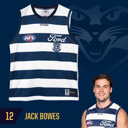 🎁 PLEASE NOTE: Guernsey will be packed in a pillow pack 📦 Includes Certificate of Authenticity & tamper-proof hologram 🏁 Officially licensed by the AFL & the Geelong Football Club (via SE Products) 📦 Dispatch within 20-25 business days of receipt from the club PLEASE NOTE: This is the guernsey worn by Jack Bowes in the first half of the 2025 Toyota AFL Grand Final. If Jack Bowes is named as the sub and does not play in the first half, this guernsey will be his player issue guernsey, and not match worn.