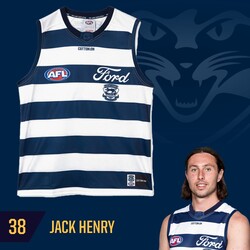 🎁   PLEASE NOTE: Guernsey will be packed in a pillow pack 📦 Includes Certificate of Authenticity & tamper-proof hologram 🏁 Officially licensed by the AFL & the Geelong Football Club (via SE Products) 📦 Dispatch within 20-25 business days of receipt from the club PLEASE NOTE: This is the guernsey worn by Jack Henry in the first half of the 2025 Toyota AFL Grand Final. If Jack Henry is named as the sub and does not play in the first half, this guernsey will be his player issue guernsey, and not match worn.