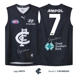 • This authentic guernsey has been certified by Carlton Football Club to SE Products - the official memorabilia licensee of the AFL - as having been the official player guernsey of Jagga Smith for the Round 1 match