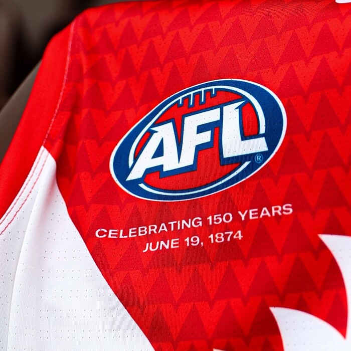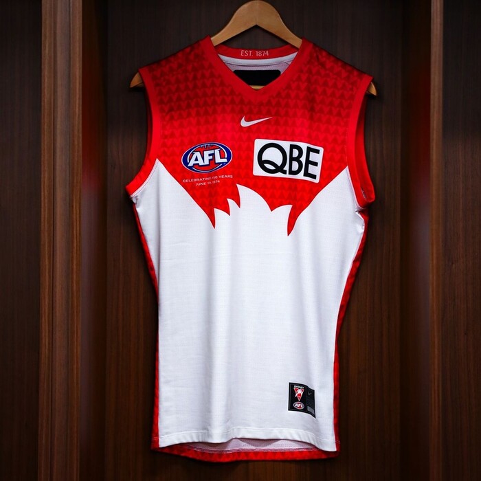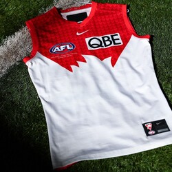 Auctions by Official Memorabilia, in conjunction with Sydney Swans, are proud to release the 150th Anniversary Guernsey Auctions. A collector's item that is a must-have for every Swans fan, this is your opportunity to secure this 150th Anniversary Guernsey from your favourite player. The guernsey is a reflection of the club's 150 year history, which began in South Melbourne in 1874 and then to the harbour city in 1982. The South Melbourne Heritage is represented through the iconic V pattern repeated through the top half of the guernsey, while the core of the club's current home guernsey shows the connection with Sydney and the club's story onwards for the next 150 years. The guernseys display the official Club and AFL logos, sponsor branding and a GPS pocket unique to on-field guernseys.