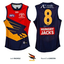 - You're bidding on Josh Rachele's official Adelaide Crows Gather Round Guernsey from the Round 5 clash against Carlton at Adelaide Oval on Thursday 9th April 2026.