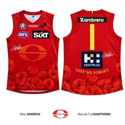 - You're bidding on Mac Andrew's official Gold Coast SUNS 2026 ANZAC Appeal Round guernsey from the Round 7 clash against Hawthorn at UTAS Stadium, Tasmania on Saturday 25th April, 2026.