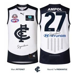• You're bidding on Marc Pittonet's official 2026 Carlton ANZAC Day Match Guernsey from the Round 7 match against and Fremantle at Optus Stadium