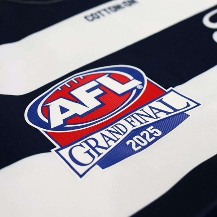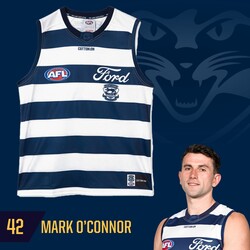 🎁   PLEASE NOTE: Guernsey will be packed in a pillow pack 📦 Includes Certificate of Authenticity & tamper-proof hologram 🏁 Officially licensed by the AFL & the Geelong Football Club (via SE Products) 📦 Dispatch within 20-25 business days of receipt from the club PLEASE NOTE: This is the guernsey worn by Mark O'Connor in the first half of the 2025 Toyota AFL Grand Final. If Mark O'Connor is named as the sub and does not play in the first half, this guernsey will be his player issue guernsey, and not match worn.