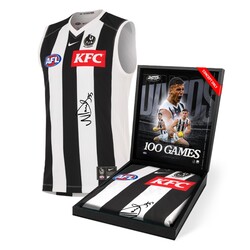 - You're bidding on Nick Daicos' official Collingwood 100th AFL Game Guernsey from the Round 6 clash against Carlton at the MCG on Thursday 16th April 2026.