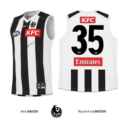 - This authentic guernsey has been certified by the Collingwood Football Club to SE Products - the official memorablia licensee of the AFL - to be the official player guernsey of Nick Daicos for the Round 6 clash between the Collingwood and Carlton.