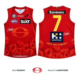 Nick Holman #7 Gold Coast SUNS ANZAC Appeal Round Player-Issue Guernsey