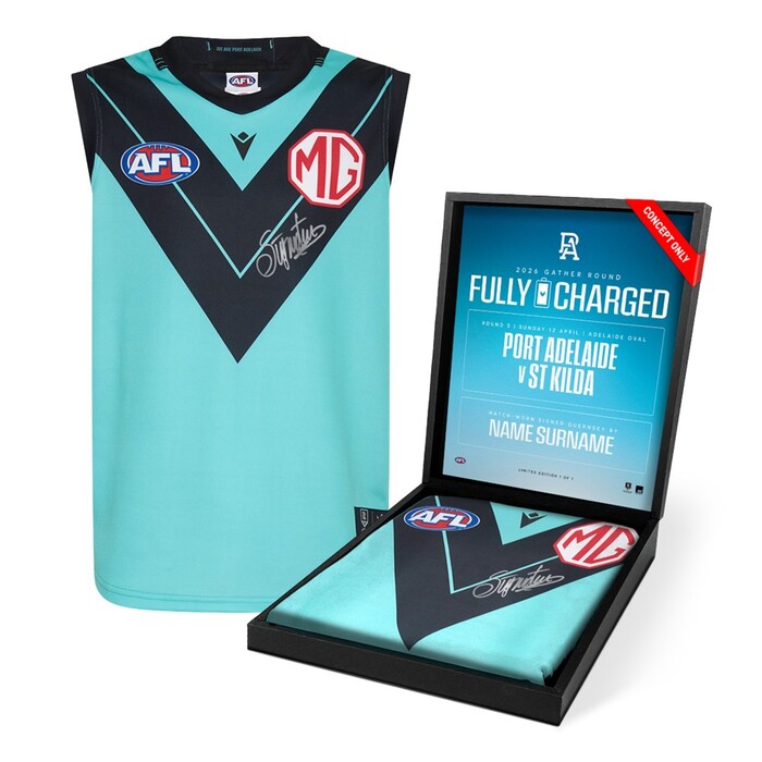 The Port Adelaide Football Club 'Fully Charged' Gather Round guernsey is a bold, teal-led design that puts the club's identity front and centre, highlighted by the iconic black 'V' across the chest. Worn during the club's Gather Round clash against St Kilda, the guernsey is part of a wider "Fully Charged" range that celebrates Port Adelaide's energy and modern look, delivering a striking on-field presence and a unique collector's piece for fans.