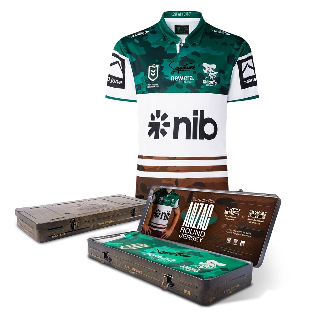 Official Memorabilia in conjunction with Newcastle Knights, are proud to release the 2025 ANZAC Jersey Auctions. A collector's item that is a must-have for every Knights fan, this is your opportunity to secure this commemorative jersey from your favourite player. The specially designed jersey pays tribute to the 35th Battalion, proudly known as "Newcastle's Own," by incorporating its traditional green and cinnamon brown colours. This battalion, comprised predominantly of men from the Newcastle region, served with distinction on the Western Front during World War I. Bearing the official Club, NRL logos and 2025 ANZAC Appeal logo, sponsor branding and a GPS pocket unique to player jerseys, this piece of history boasts an undeniable sense of authenticity. It is a true collector's item that will take pride of place in any collection.