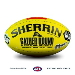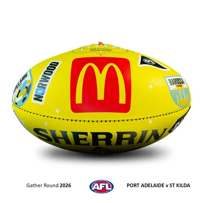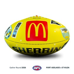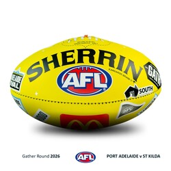 - You're bidding on an official match-used Sherrin from the Gather Round clash between Port Adelaide and St Kilda at the Adelaide Oval on Sunday 12th April 2026.