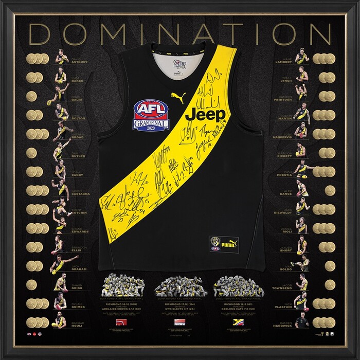 • Features an officially licensed Richmond 2020 Grand Final guernsey, personally signed by every single 2017, 2019 & 2020 Premiership player, along with three-time Premiership coach Damien Hardwick - an impressive 30 signatures in totality