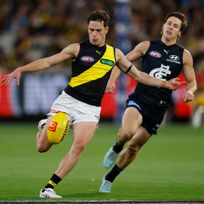 In his AFL debut for the Richmond Football Club against the Carlton Football Club, Sam Grlj delivered an impressive performance off half-back. The young defender finished with 19 disposals at around 90% efficiency, along with 7 marks, 4 tackles, 5 intercepts and 5 score involvements. His composure with the ball and ability to read the play helped provide strong rebound from defence and made for a promising first outing at AFL level.