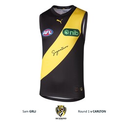 - This authentic guernsey has been certified by Richmond to SE Products - the official memorablia licensee of the AFL - to be the official player guernsey of Sam Grlj for the Round 1 clash between Richmond and Carlton.