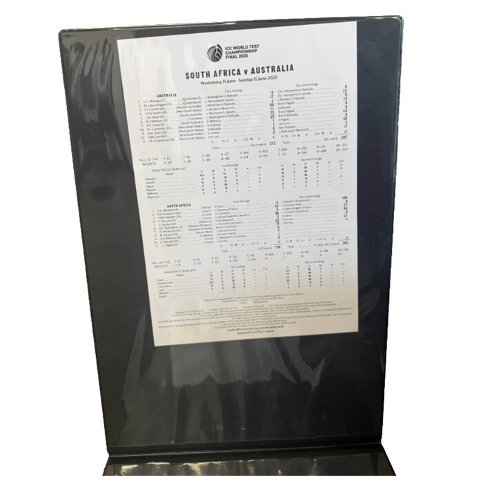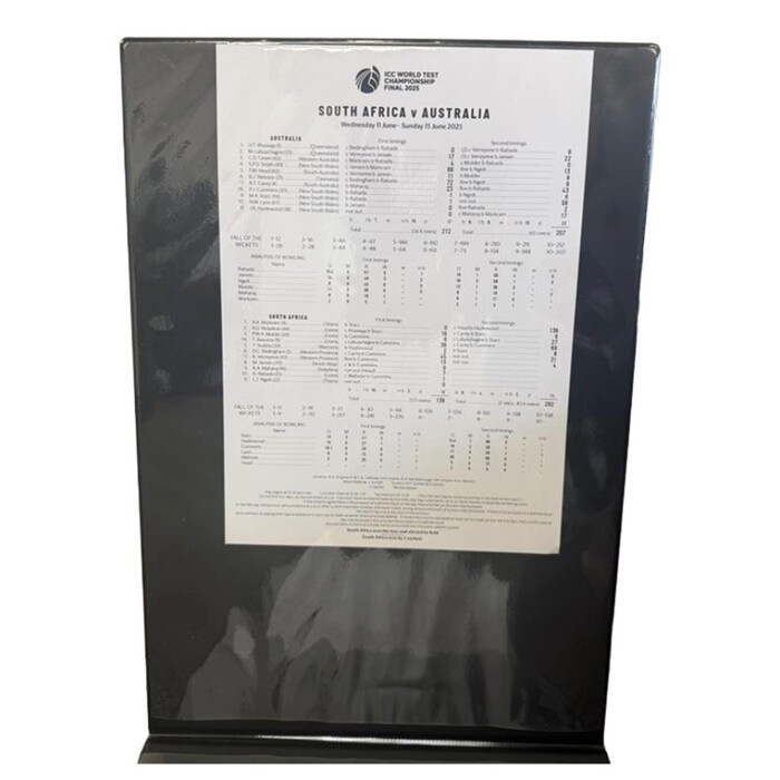 • This authentic scorecard has been certified by the ICC as having been the official scorecard of the 2025 ICC World Test Championship Final South Africa and Australia at Lord's Cricket Ground, London.• The only item of its kind commercially available worldwide