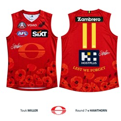 - You're bidding on Touk Miller's official Gold Coast SUNS 2026 ANZAC Appeal Round guernsey from the Round 7 clash against Hawthorn at UTAS Stadium, Tasmania on Saturday 25th April, 2026.