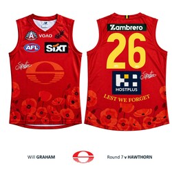 - You're bidding on Will Graham's official Gold Coast SUNS 2026 ANZAC Appeal Round guernsey from the Round 7 clash against Hawthorn at UTAS Stadium, Tasmania on Saturday 25th April, 2026.